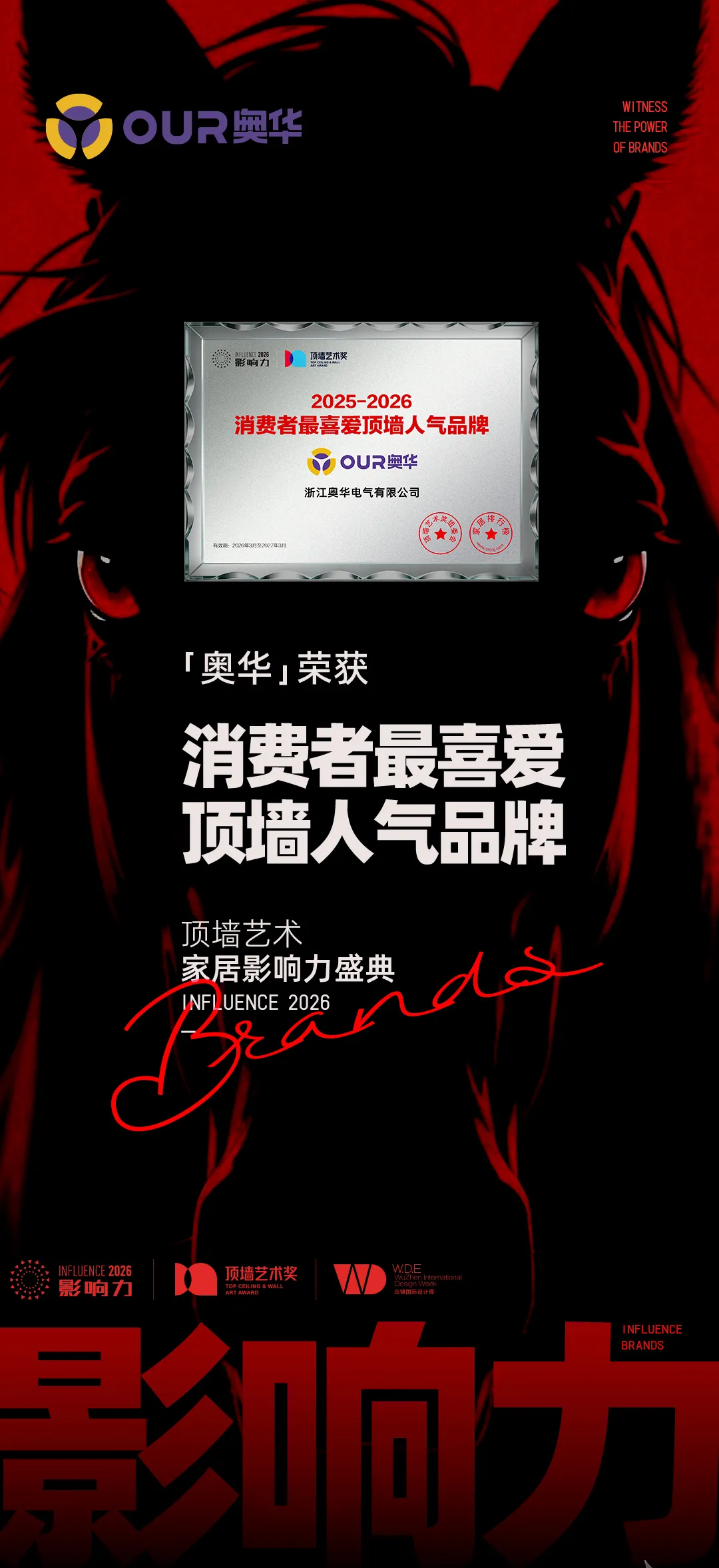 奥华凭借卓越的产品力、创新力与市场口碑,一举斩获"整装定制公认一线品牌"、"顶墙公认一线品牌"、"顶墙工装材料影响力品牌"、"消费者最喜爱顶墙人气品牌"四项重磅殊荣,成为本届盛典大赢家,全面展现其在顶墙整装领域的领军地位与综合竞争力。