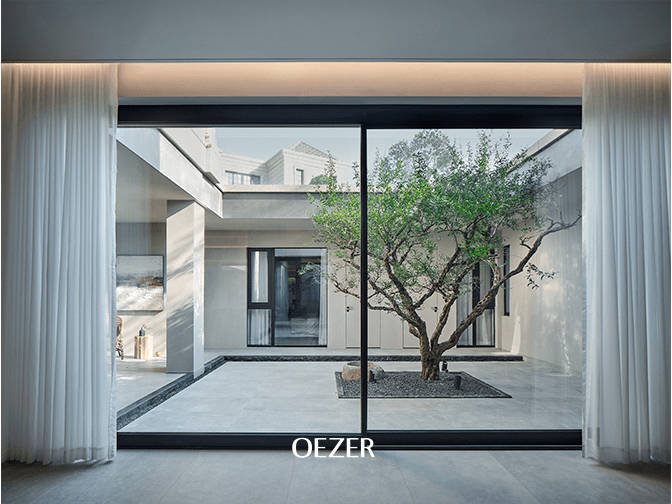 如何增加采光和通风、视野相通、调性统一,是庭院的设计痛点。结合建筑主体结构,设计师最终选用了OEZER欧哲「莱茵晨光二轨推拉门」作为连接室内外的通道。