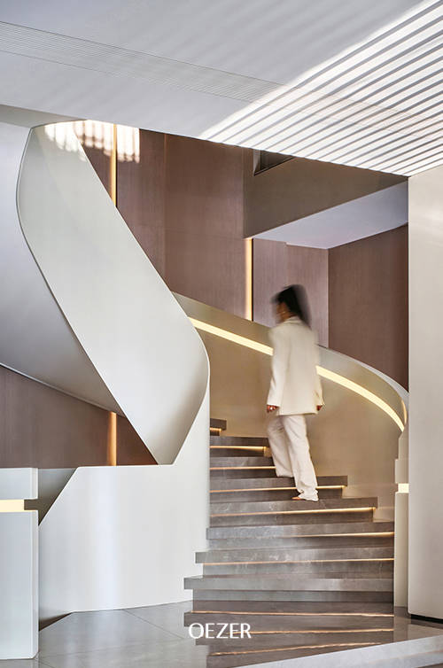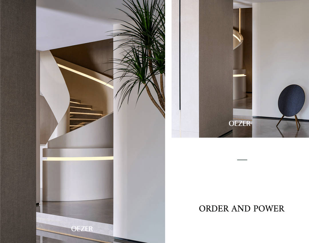 视线延伸而去,柱体凹缝与大块木饰面,构筑了整体的节奏与序列感。布艺岩板、艺术楼梯、温润木质与梁柱的层次处理,更加强了建筑层次关系。